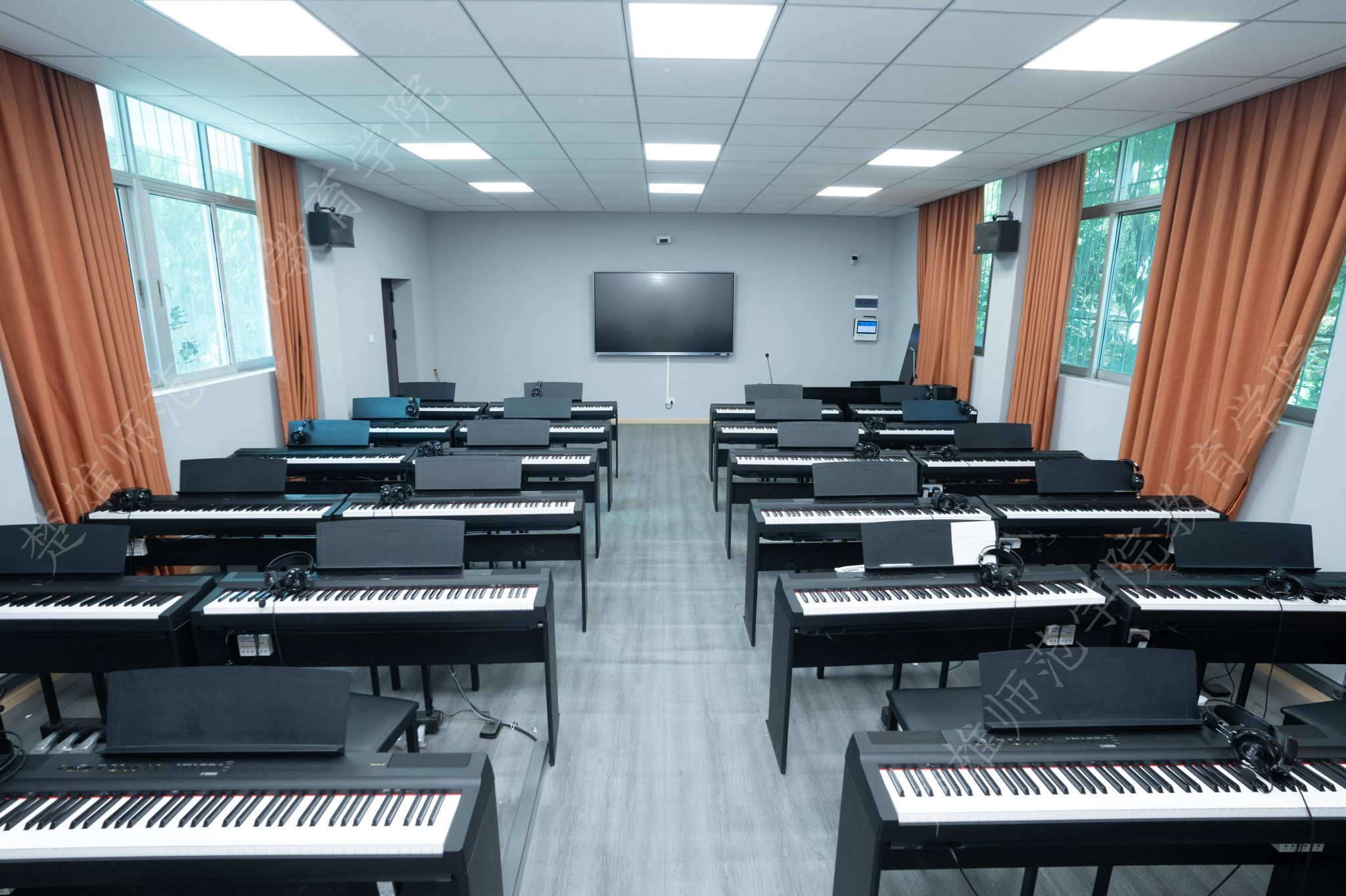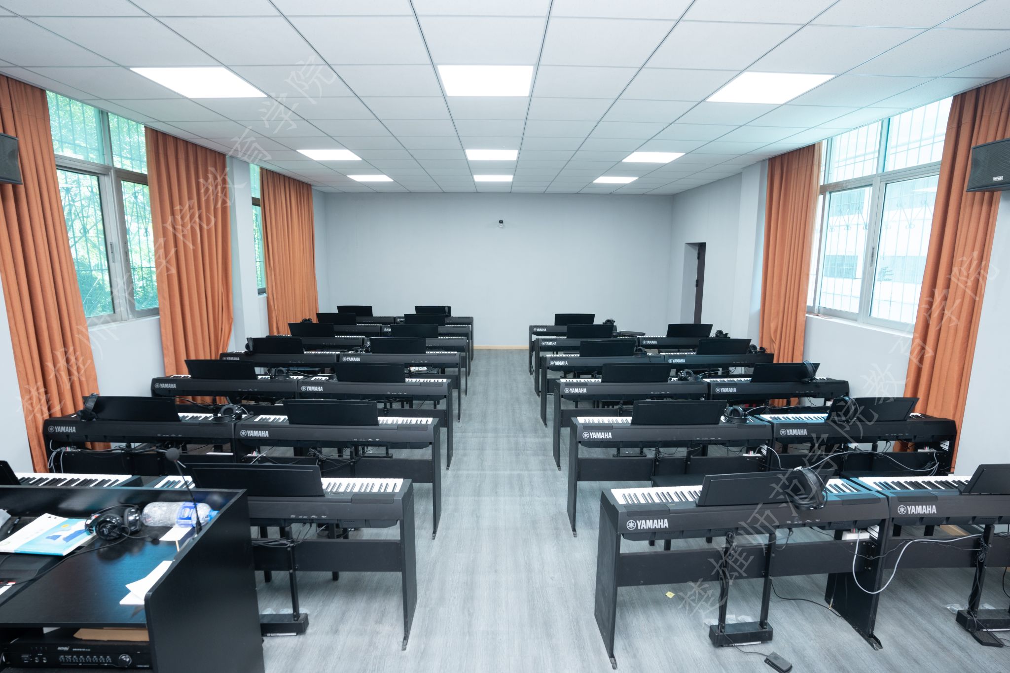 智慧音乐教学综合实训与创新平台包含电子琴、音乐教学互动平台、教师指法采集器、交互设备、控制设备、音频设备等160台件。以音乐教育实训为核心,配备60台电子琴、10台数码钢琴及5台立式钢琴,支持钢琴基础弹奏、即兴伴奏、合奏等集体课教学与分组训练,提升学生演奏技巧与音乐表现力;依托三芙教学控制系统实现课堂计时、分组授课、终端故障提示等智能化管理,强化师生互动与教学效率;通过鸿合交互一体机及五线谱电教板支持五线谱/简谱动态教学、多媒体课件演示及音视频资源播放,辅助乐理知识与创作实训;搭配功放、音响等音频设备构建高质量声音环境,满足演奏音效实时反馈与教学音频处理需求;教学控制系统通过以太网连接64个终端,支持分组授课、课堂计时、教学笔记自动存储及故障智能提示,实现音乐教学的流程化管理与个性化指导;鸿合交互一体机凭借双系统架构、10点触控及无线传屏技术,支持多格式课件动态演示、手机/平板实时投屏及远程视频会议,适配混合式教学场景下的资源共享与互动教学;卡西电子琴与卡西欧数码钢琴内置丰富音色、节奏编辑及录音功能,结合教学控制系统,可开展数字音乐创作、演奏实时录制与回放分析,助力学生乐理实践与即兴创作能力培养。