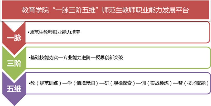 教育学院“一脉三阶五维”师范生教师职业能力发展平台,立足“秉承师范教育传统,彰显教师教育特色”的人才培养理念,以师范生教师职业能力培养为核心脉络(一脉),遵循“基础技能夯实—专业能力进阶—反思创新突破”的进阶路径(三阶),紧扣“教-学-研-训-智”一体化主线(五维),系统构建了资源数据支撑、数智技术赋能、智慧课程引领的教师教育生态系统。