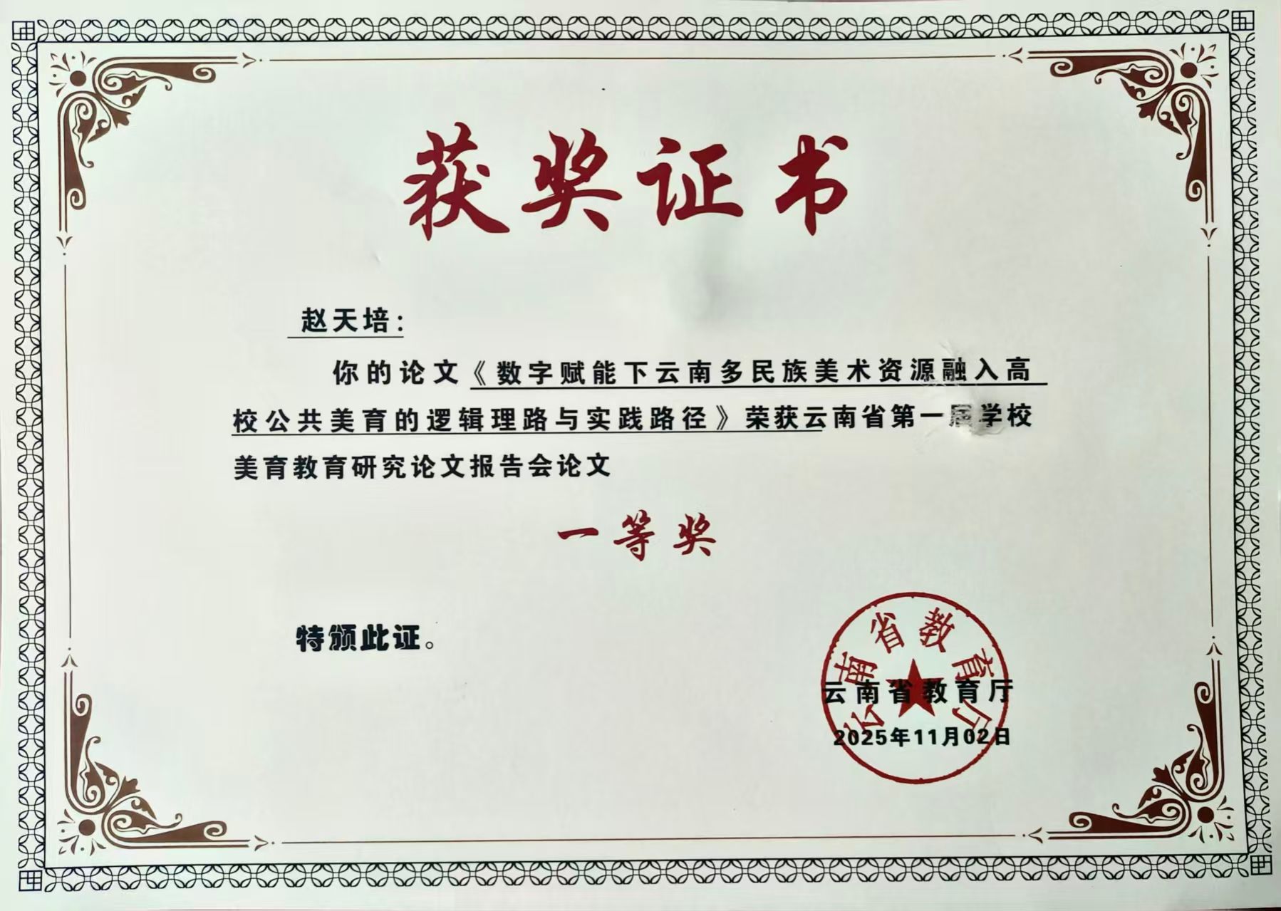 教育学院赵天培老师的论文《数字赋能下云南多民族美术资源融入高校公共美育的逻辑理路与实践路径》聚焦云南多民族美术资源与高校公共美育的深度融合,紧扣数字时代美育发展趋势,深入剖析了“资源挖掘—数字转化—课程融入—价值升华”的实施逻辑。该研究立足云南多民族文化沃土,为高校公共美育课程建设、资源开发提供了前瞻性思路,获评审专家一致好评,获得一等奖,并被推荐为高校组第一推荐汇报发言人。