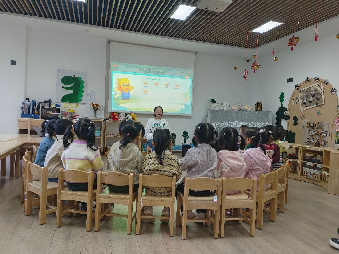 环境作为“隐性课程”,也成为同学们重点观察的内容。从“爱上幼儿园”主题墙上记录成长的照片与绘画,到“慢慢我学会了”中幼儿学习自理的过程展示,再到“从头动到脚”区中充满艺术感的“手掌树”,每一处布置都承载着教育的意图与温度。英语活动区中,教师运用“Hello Teddy”多媒体课件,以动画与儿歌相结合的方式开展英语启蒙,让孩子们在愉悦的氛围中接触语言、感受韵律。