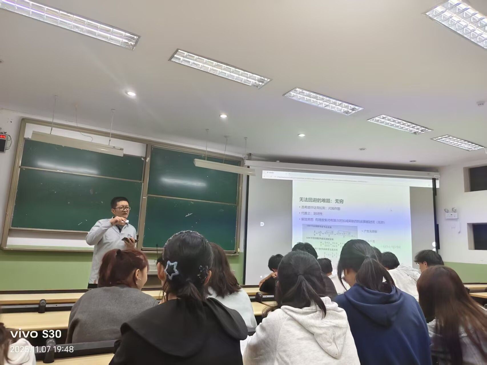 为帮助学生破解高等数学学习难题,夯实专业知识基础,小学教育系数学教师刘鹏于11月7日在笃学楼110阶梯教室开展了一场主题为“如何学好高等数学”的专题讲座。25级小教优师2班,25级小教公费1班,2班,3班,共150多名学生到场学习,现场学习氛围浓厚。