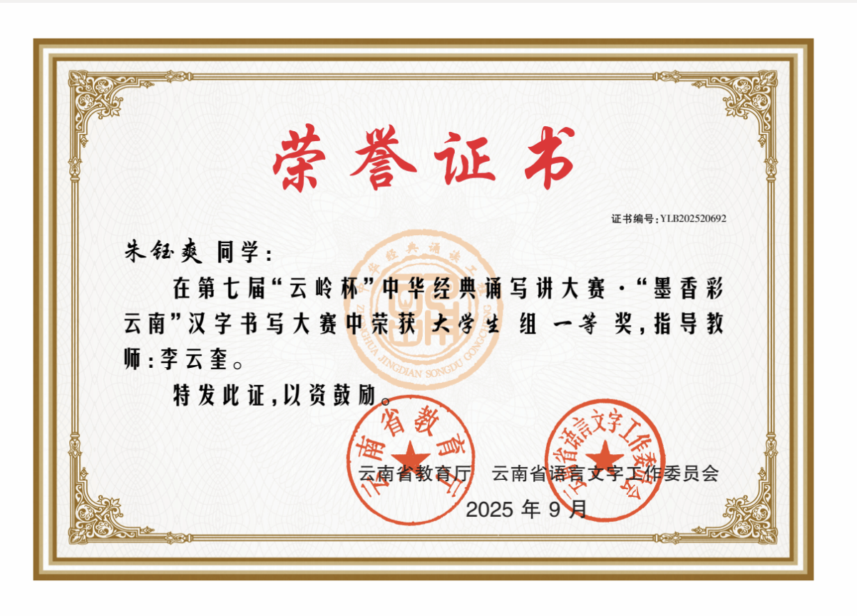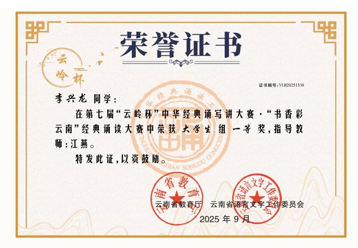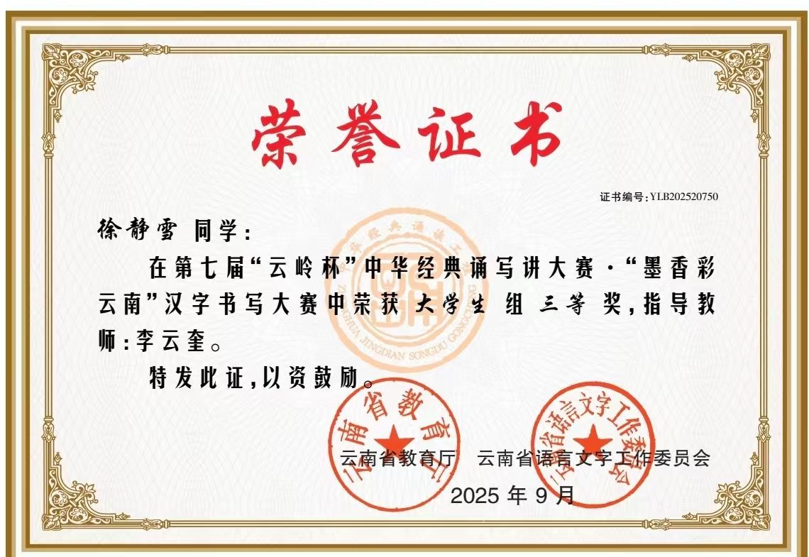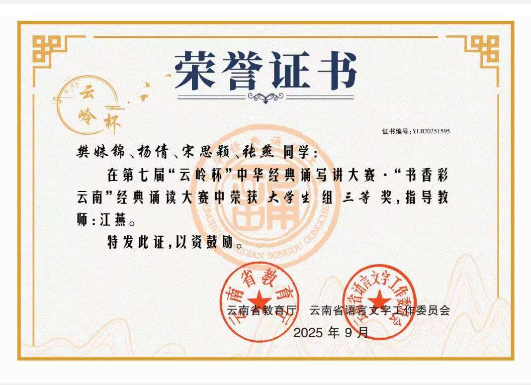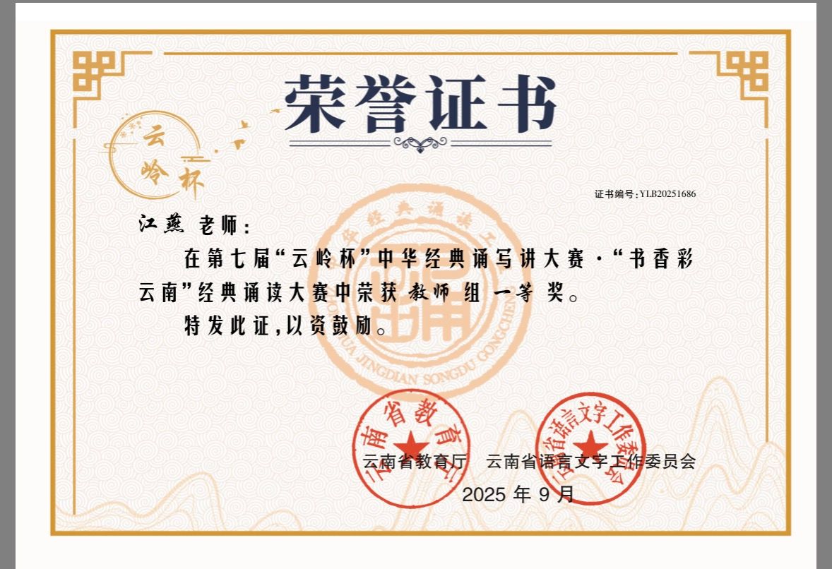 近日,第七届“云岭杯”中华经典诵写讲大赛评选结果正式揭晓。教育学院师生在“墨香彩云南”汉字书写大赛与“书香彩云南”经典诵读大赛两个核心赛项中表现卓越,共荣获9个奖项,包括一等奖4项、二等奖1项、三等奖3项,以及优秀指导教师奖1人(李云奎老师)。其中,江燕老师凭借出色表现,荣获“书香彩云南”经典诵读大赛教师组一等奖。