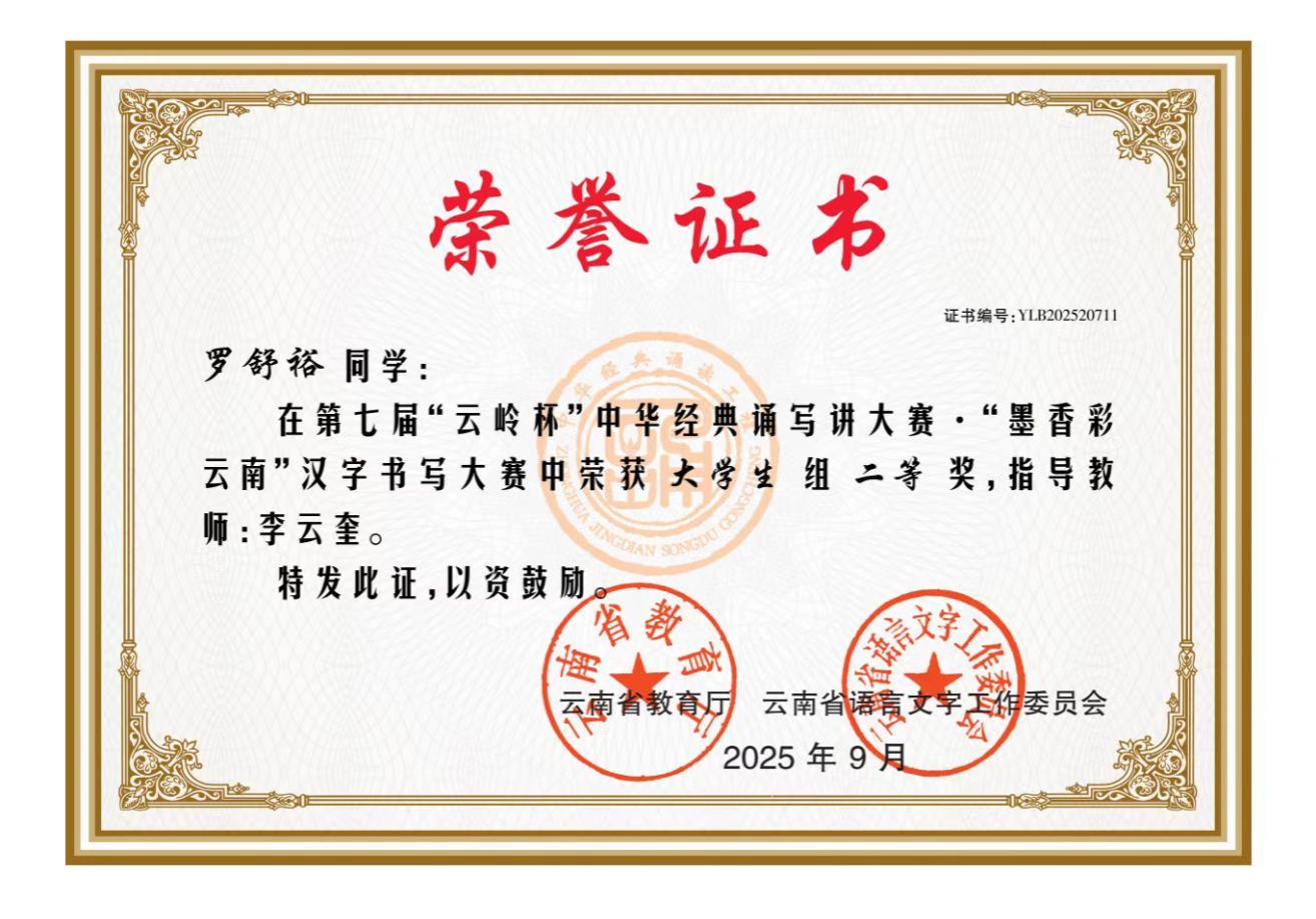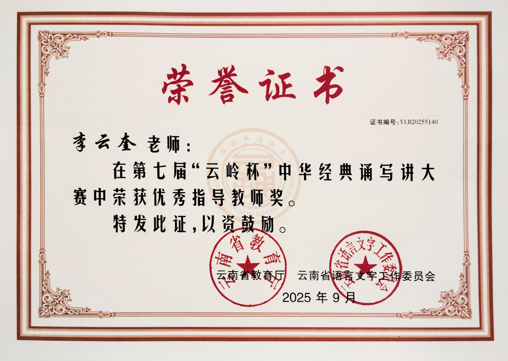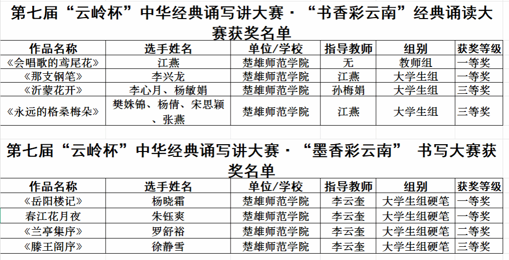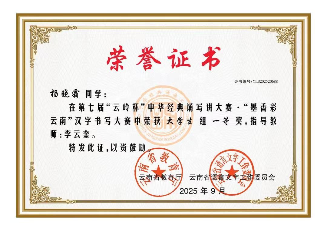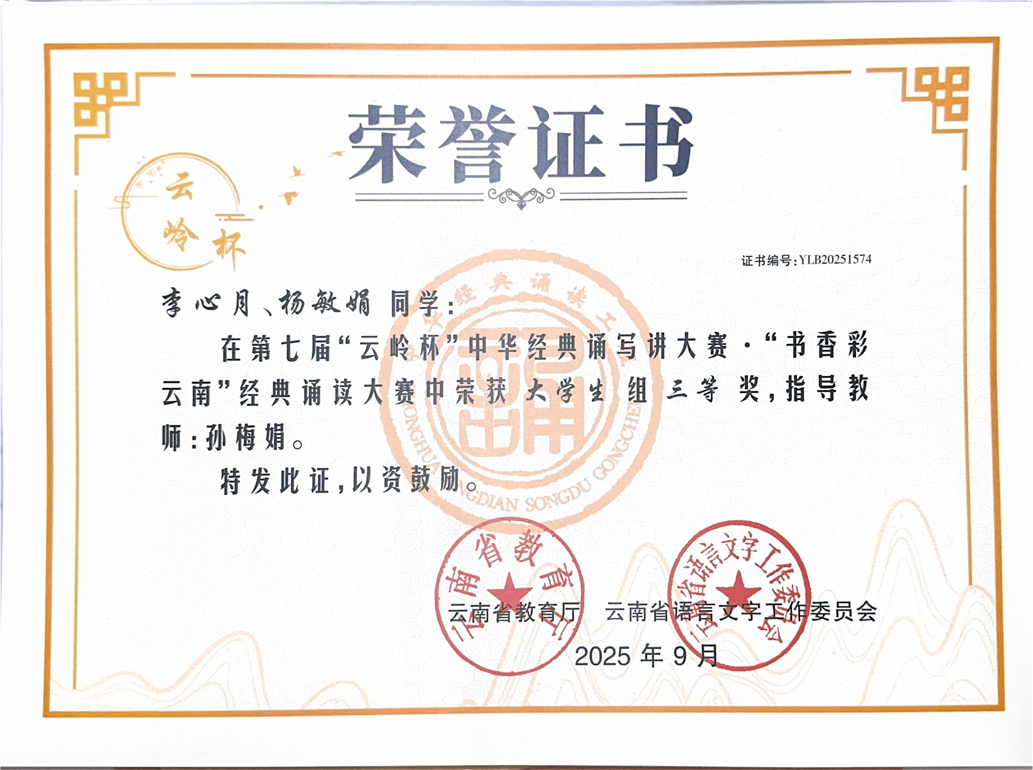 近日,第七届“云岭杯”中华经典诵写讲大赛评选结果正式揭晓。教育学院师生在“墨香彩云南”汉字书写大赛与“书香彩云南”经典诵读大赛两个核心赛项中表现卓越,共荣获9个奖项,包括一等奖4项、二等奖1项、三等奖3项,以及优秀指导教师奖1人(李云奎老师)。其中,江燕老师凭借出色表现,荣获“书香彩云南”经典诵读大赛教师组一等奖。
