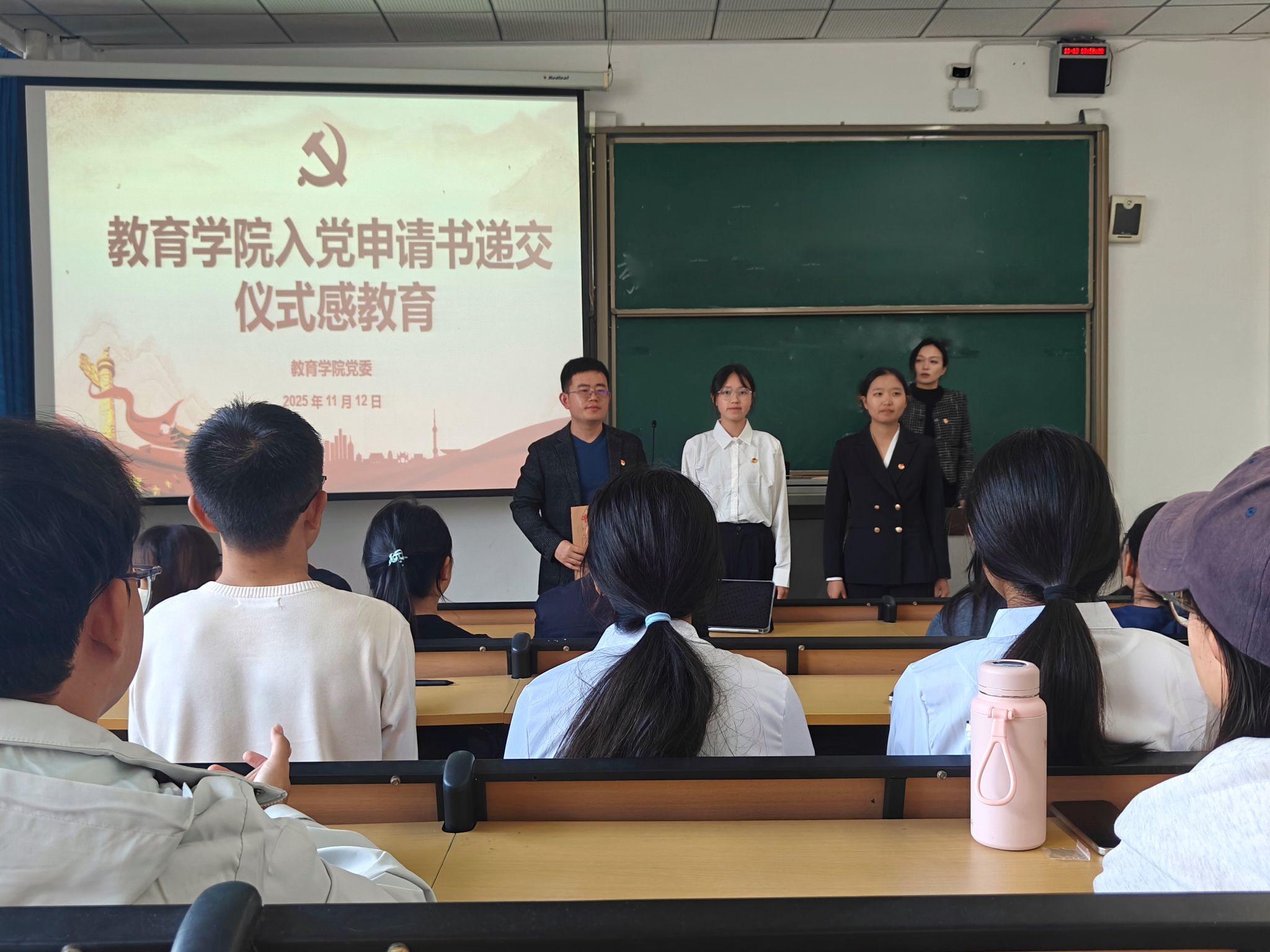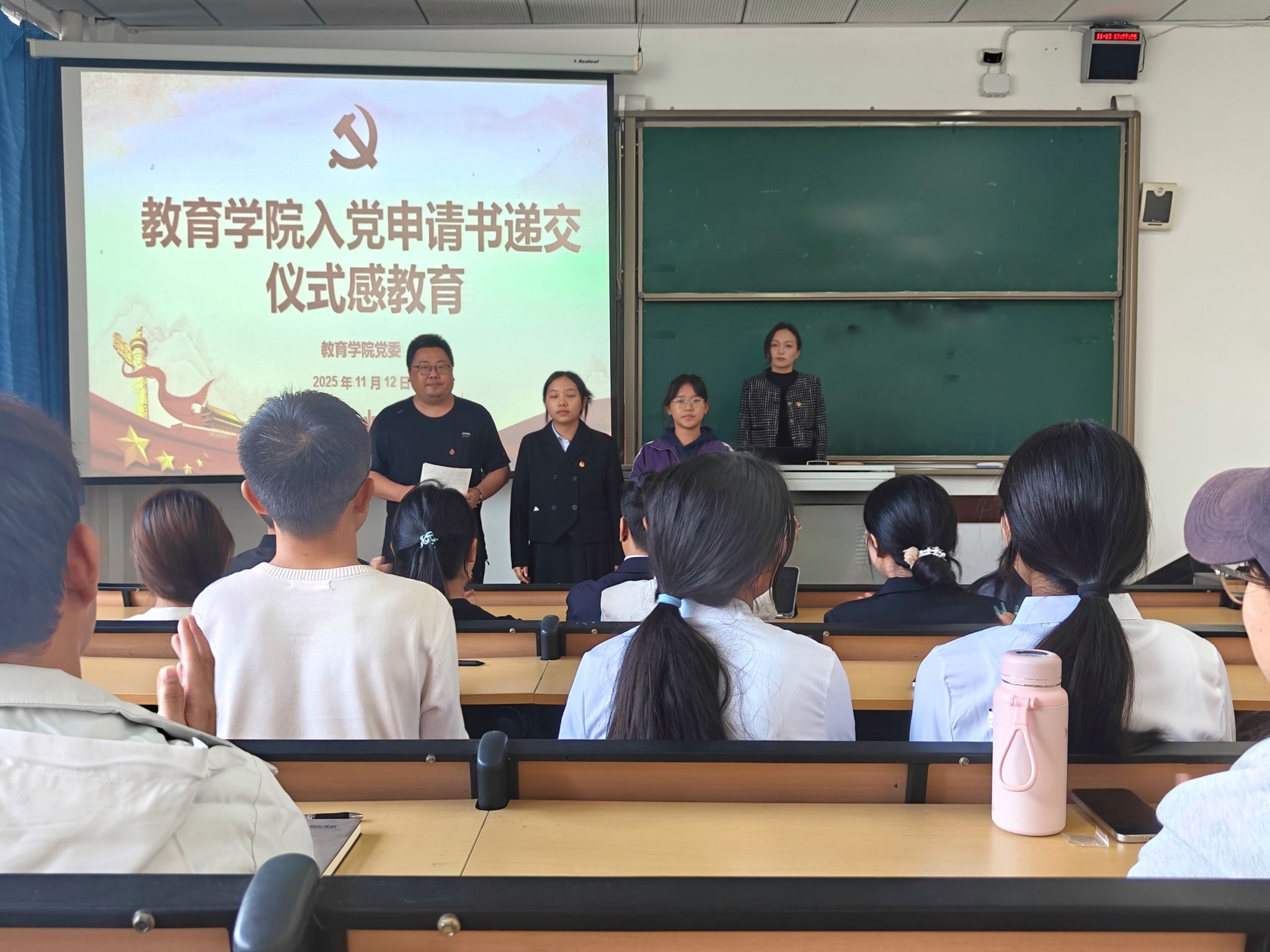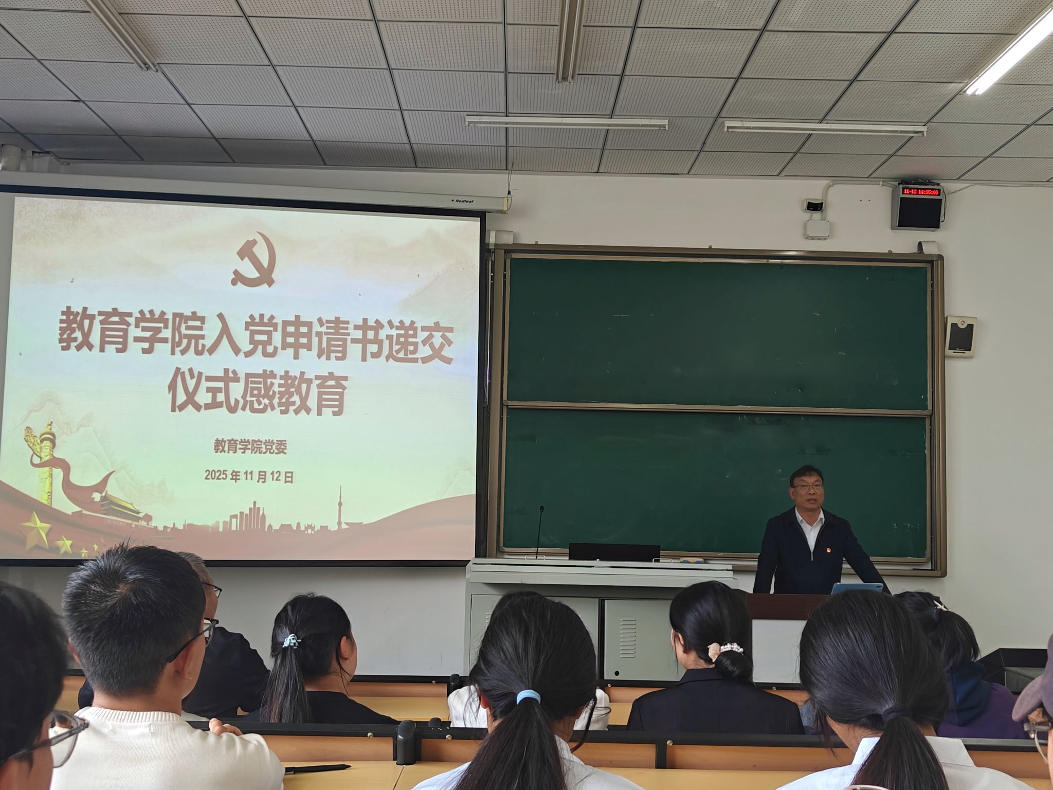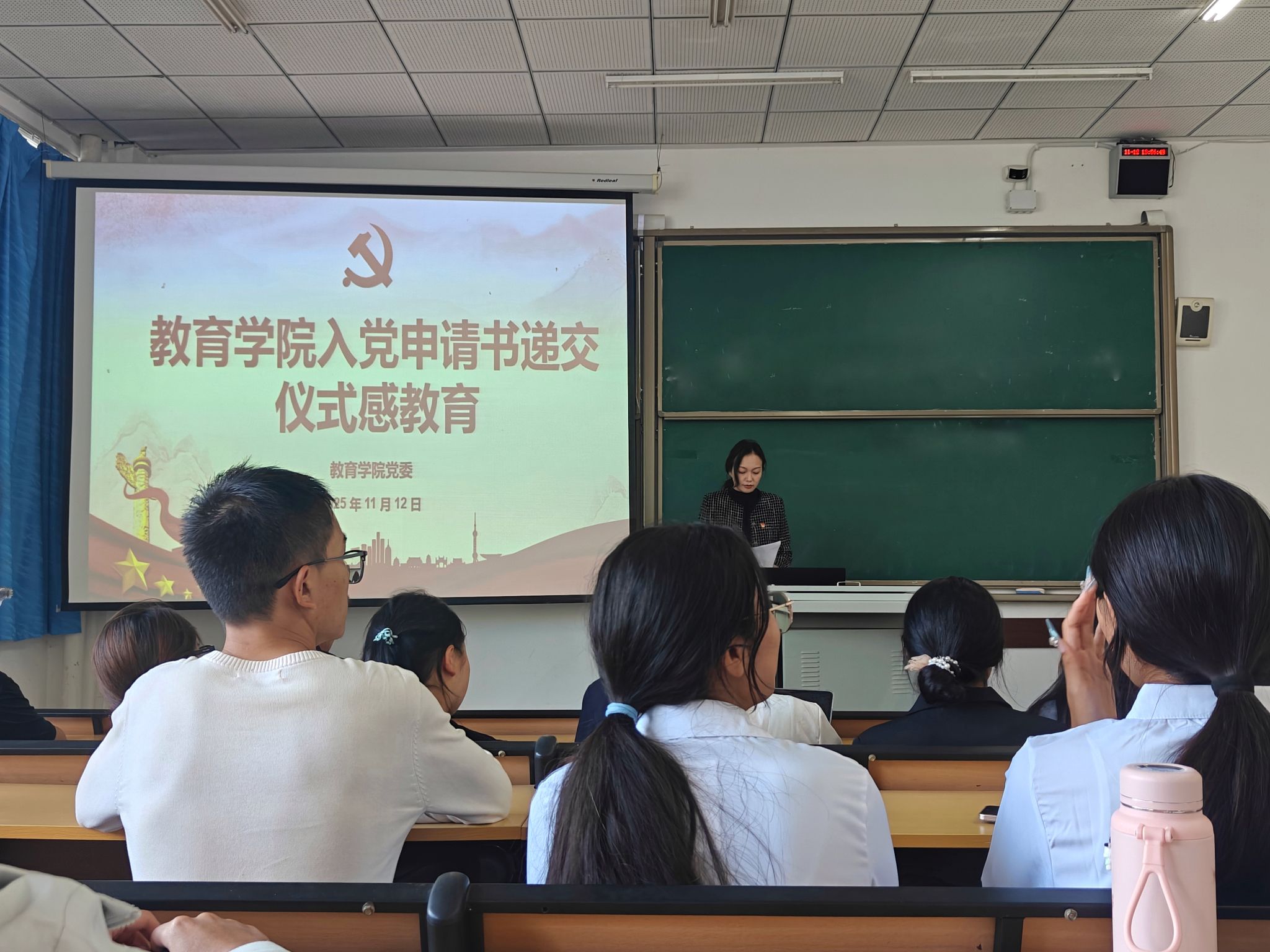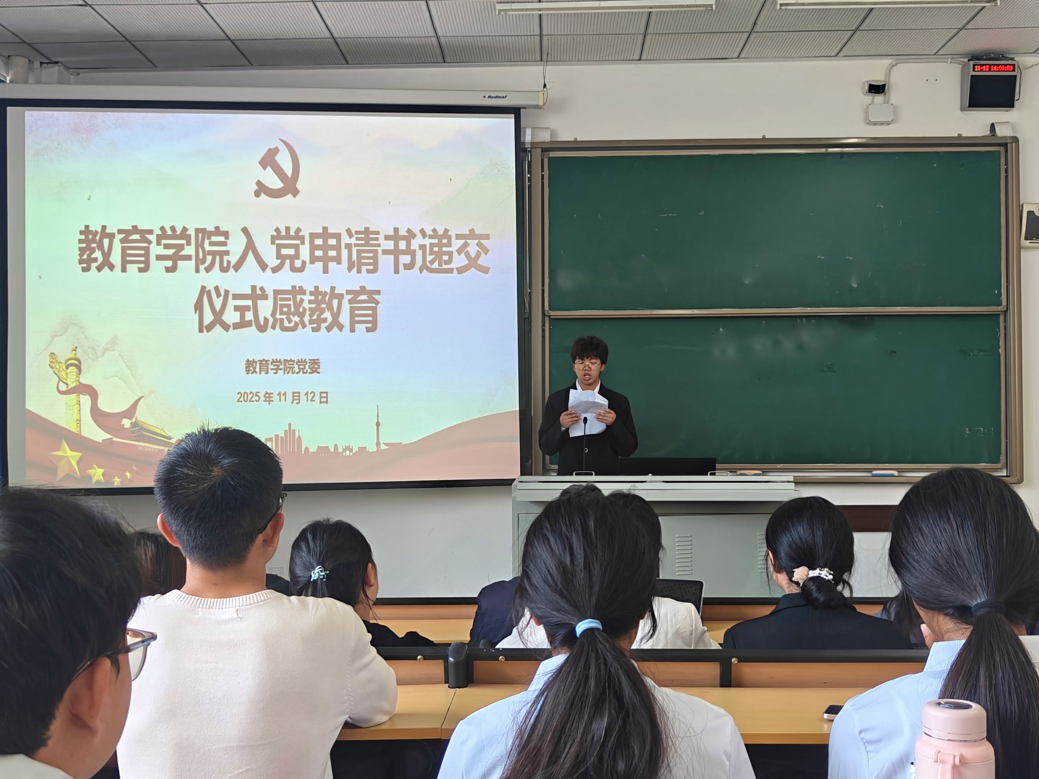 为进一步加强对入党申请人的教育培养,端正入党动机,明确入党程序和努力方向,2025年11月12日,教育学院党委在博雅楼102阶梯教室举行“入党申请书递交仪式感教育”。 此次活动由学院专职组织员李玥主持,学院党委书记李飞、副书记庄晓薪、各学生党支部书记出席活动,134名递交入党申请书的2025级新同学参加了教育活动。
