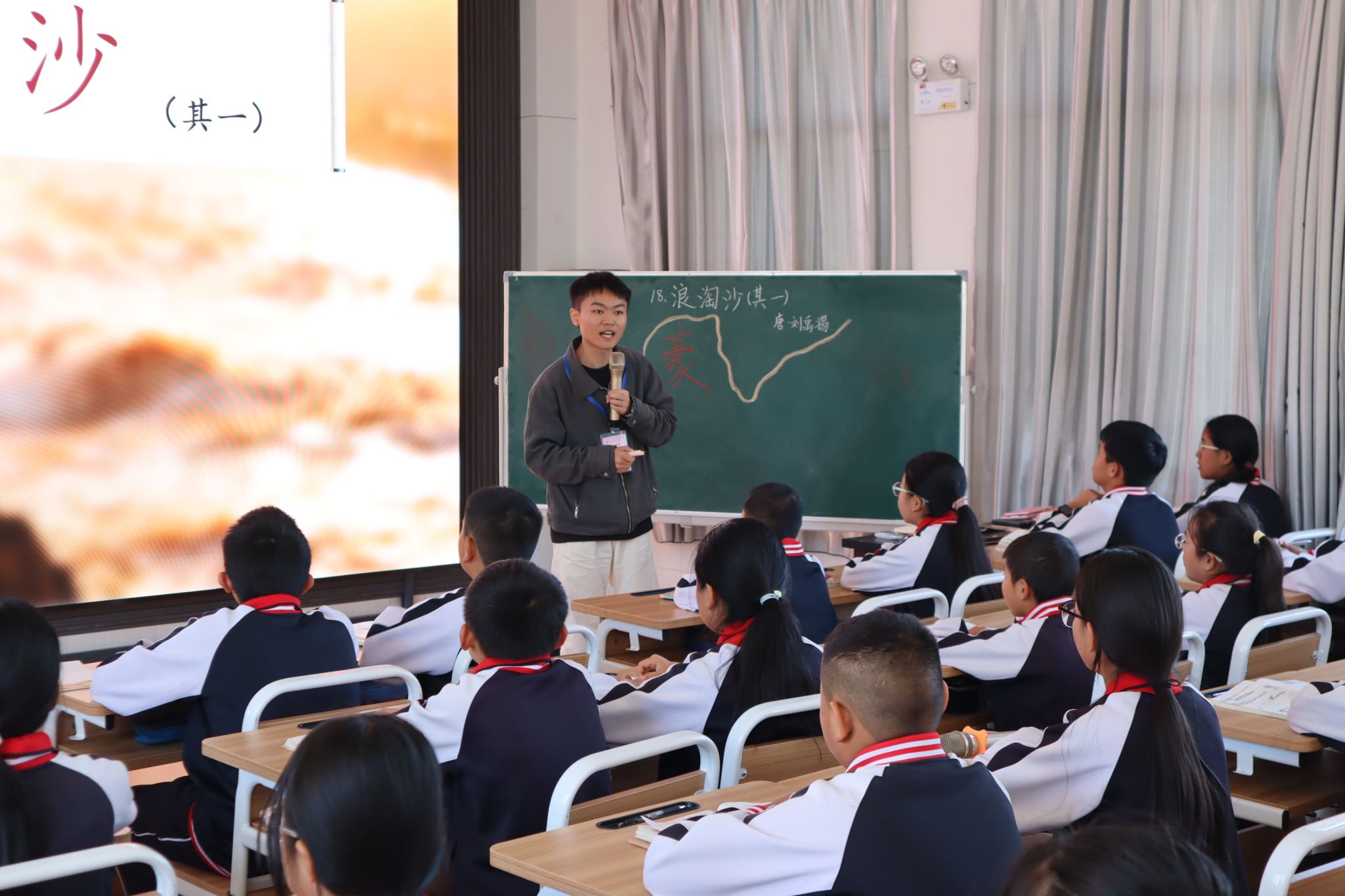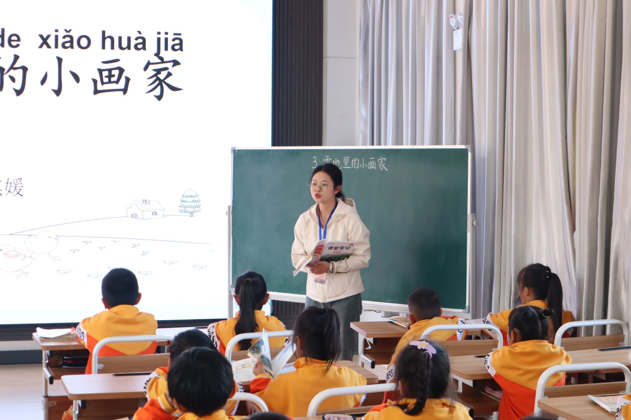 语文课堂上,实习生们紧扣新课标核心素养,或通过卡通图、角色扮演激发低年级学生兴趣,或借助问题链与文学性板书引导中高年级学生品味文学意境、增强文化自信。