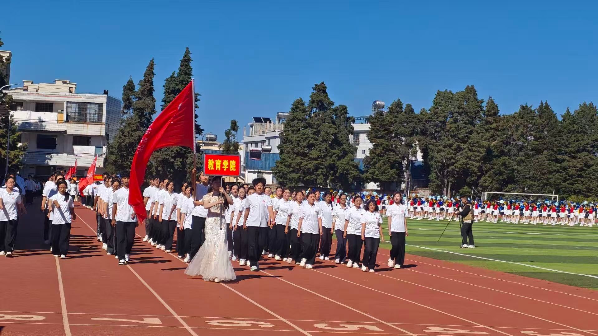2025年12月10日,楚雄师范学院第二十四届冬季运动会在雁塔校区田径场隆重开幕。教育学院代表队以整齐的步伐、昂扬的姿态列阵入场,青春洋溢、自信坚定,充分展现了新时代师范学子蓬勃向上的精神风貌。