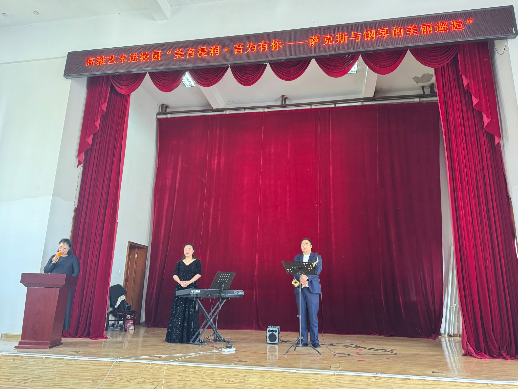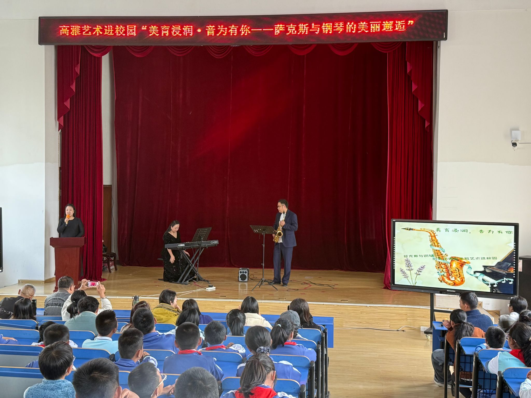 在沧源县国门小学报告厅举办的“美育浸润,音为有你——萨克斯与钢琴的美丽邂逅”音乐会,将本次活动推向高潮。陈鑫、贡鸣两位教师联袂演出,曲目涵盖云南民歌、西方古典、近现代中外名作及动画配乐,兼具民族性、艺术性与普及性,为师生带来一场多层次的艺术体验,生动诠释了“以美育人、以文化人”的浸润理念。