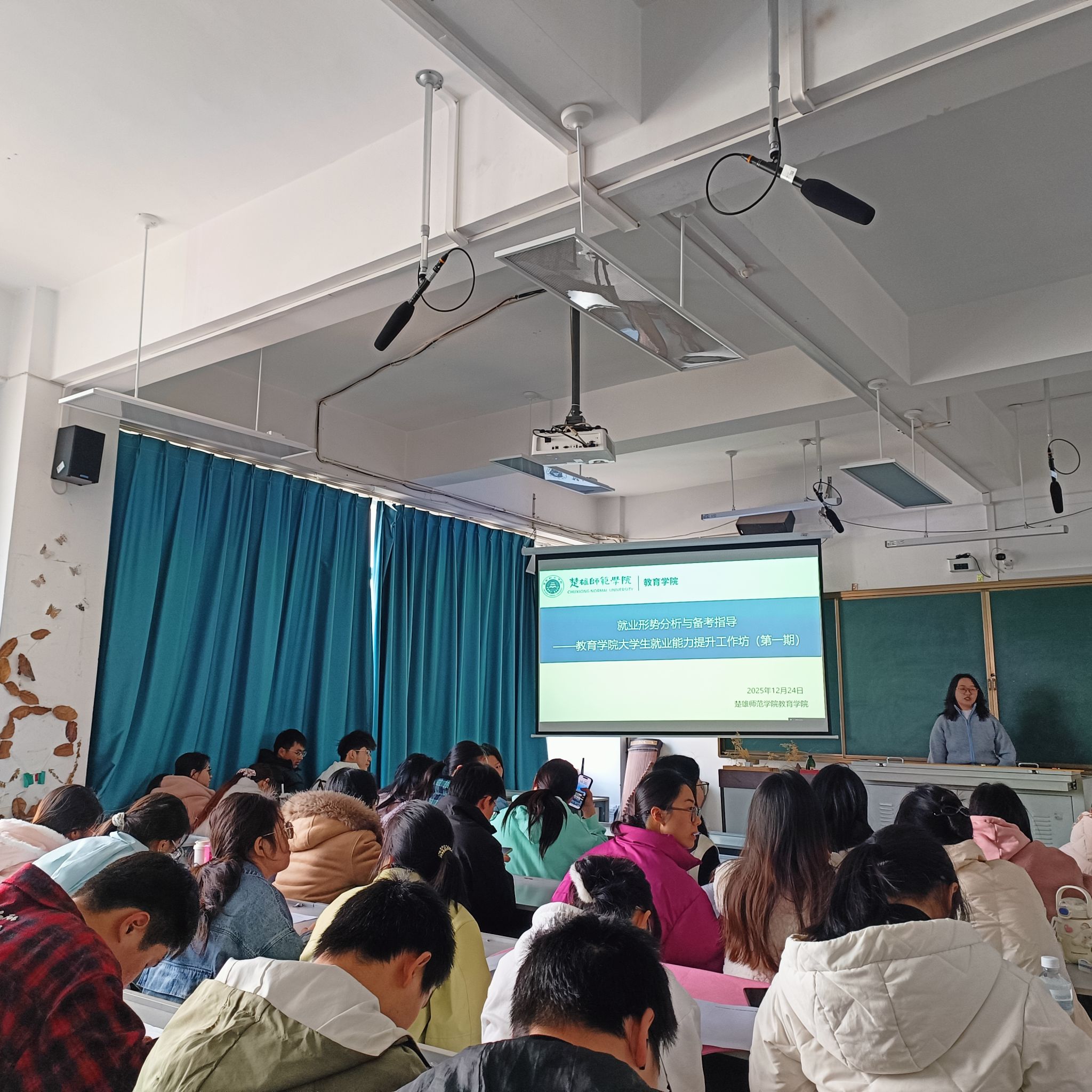 为帮助2026届毕业生准确把握就业市场动态、提升就业竞争力,教育学院于2025年12月24日下午举办了毕业生就业能力提升工作坊(第一期)专题讲座。本次讲座由学院就业创业工作办公室陈燕芳老师主讲,面向2022级小学教育、学前教育、音乐学等专业学生,旨在引导学生理性研判就业环境、掌握求职技能、合理规划备考路径。