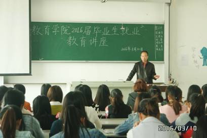 2016年3月10日下午14:30,教育学院在励志楼310教室开展了2016届毕业生就业教育讲座,由党委副书记吴永社老师主讲,我院2016届毕业生参加了此次讲座。