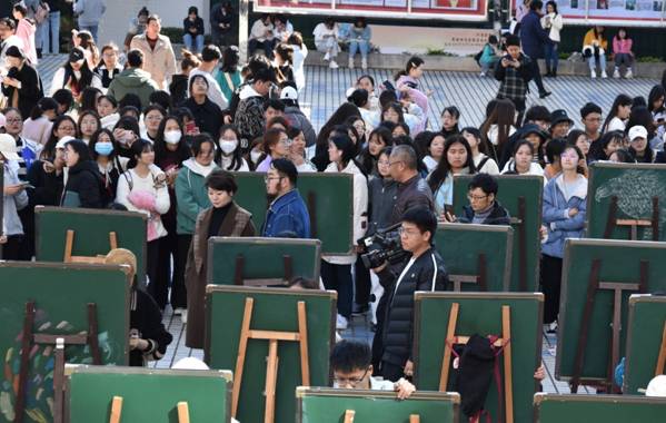 下午2:30,云南工商学院教育学院一行观摩了我院正在笃学楼前广场上举行的第十六届“师艺风”板画展示赛。