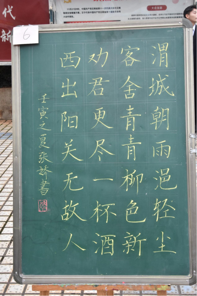 书写靓风采,墨香飘校园。为提高我院师范生专业素养,提升未来教师教学能力,夯实我院学子板书基本功,2022年6月15日下午,我院第十六届“师艺风”板书大赛(决赛)在楚雄师范学院花果山校区凯旋门成功举办。本次决赛评委由教育学院吴永社老师、赵天培老师和李云奎老师担任。同时,还邀请了教育学院全体教师观赛。