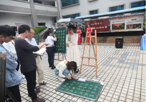比赛结束后,评委们从布局、字形结构、书写规范等方面对板书进行评判。